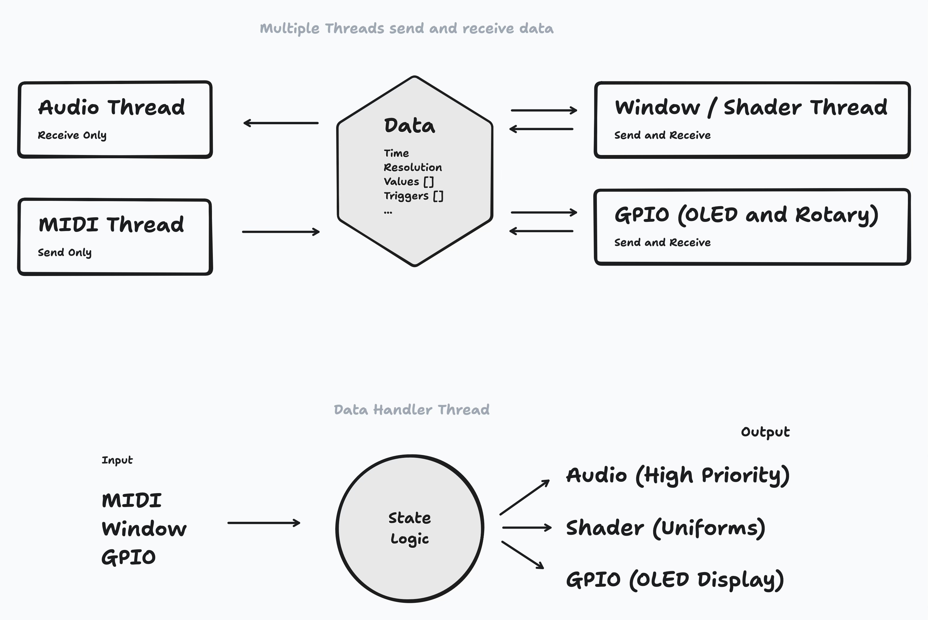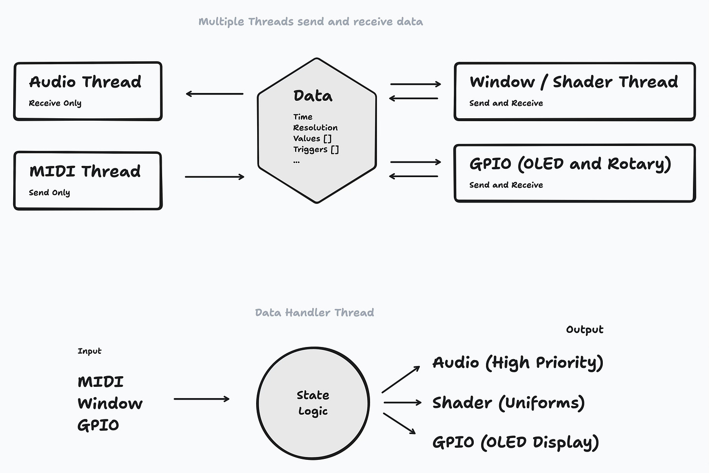 The way data is sent or received can be different for each thread. For example, the MIDI thread uses a Crossbeam channel to send messages to the coordinator, which then get parsed and update the state. The audio thread uses a triple buffer to get the current state from the coordinator.