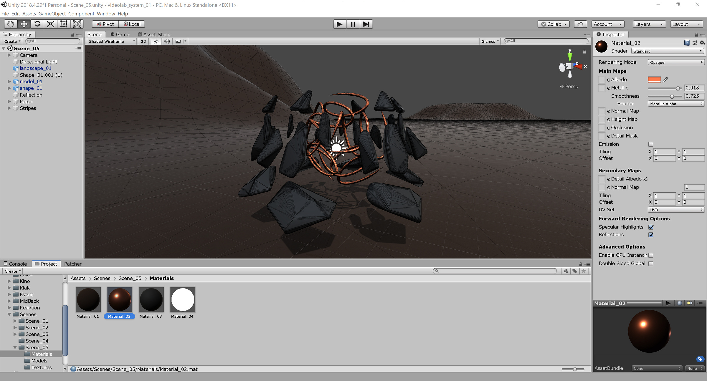 Since the engine to a huge part shapes the look of a scene, I did all the materials and lighting in there. While in blender it looked pretty nice, it did not do that in unity, which is somehow related to the fact that you have to use a 2018 version to run it properly.