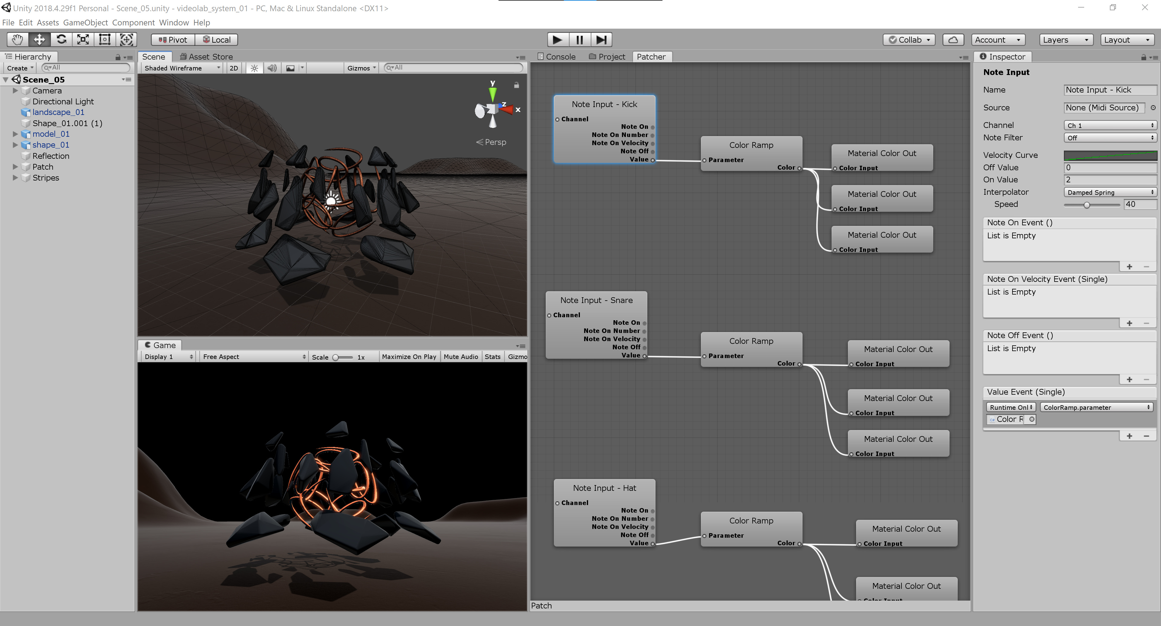 The most interesting part is of course hooking it up the midi controller. There is a node based interface called klak, which comes with videolab. But you can use it dependently as well and integrate it into other unity projects.